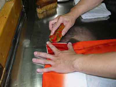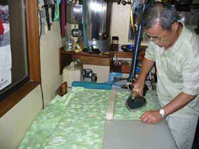 仕上げは着物専用の仕上げ台にてアイロンは直接着物にあてがわず、1cm位浮かしております。表から、裏から、再度表からの三回仕上げで、お仕立て上がり同様の仕上りです。