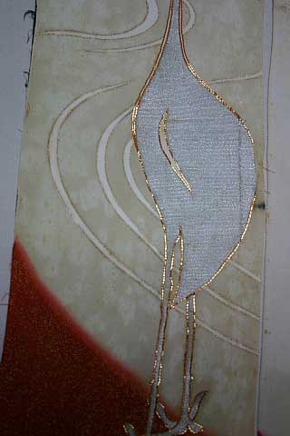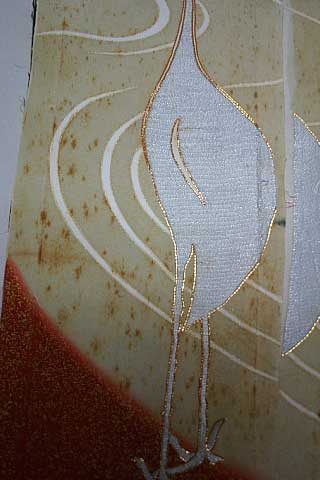 もう一つの方法は模様の金砂を除去した後、変色を一粒づつ根気良く漂白して金砂加工を施す方法です。この方法は模様のイメージを尊重する事が出来ますが、職人の立場から申しますと手間も神経も使う仕事となりますので出来れば余り関りたく無いのが本音です。加工代は通常の生け洗いしみぬき料金の3〜4倍程度はご予算下さい