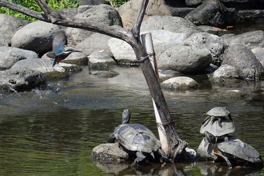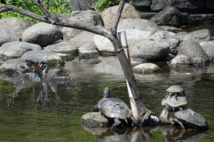 カメがこおら干しをしている近くにカワセミが飛び込みました。 30.9.5水元公園かわせみの里にて撮影