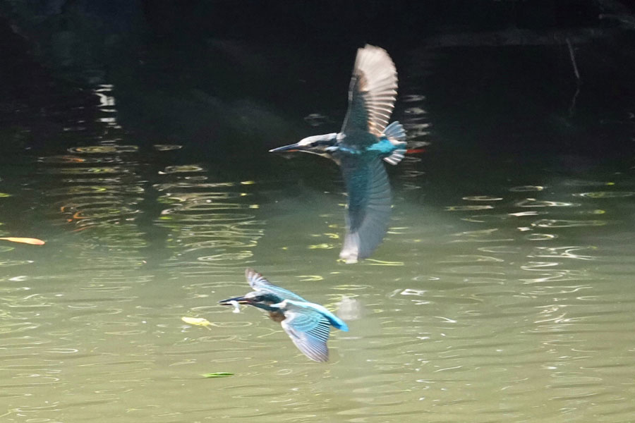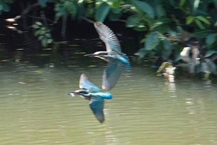 メスのカワセミが魚をゲットした瞬間オスのカワセミが横取りしようと現れました。