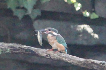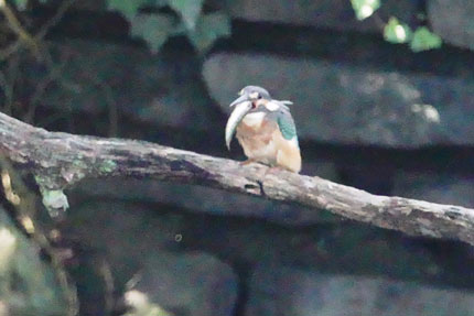 何とかオスのカワセミから逃れ、かわせみの里の休憩所近くの枝に止まり、かなり苦労しながら大きな魚を呑み込みその後2時間以上姿を現しませんでした。捕った魚はライギョの子供でした。