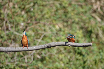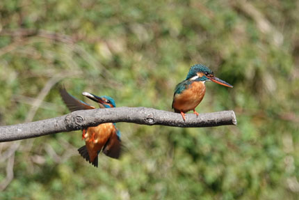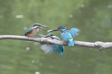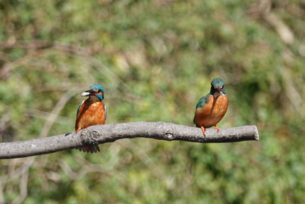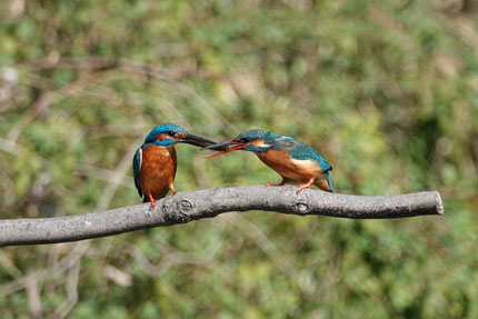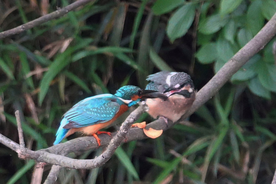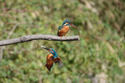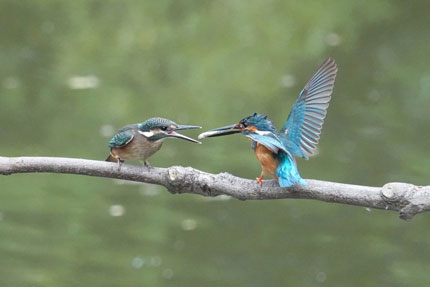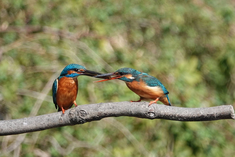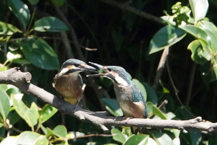 この時期(オス)のカワセミは(メス)のカワセミに魚をプレゼントし彼女の気をひく行為を頻繁に行います。
