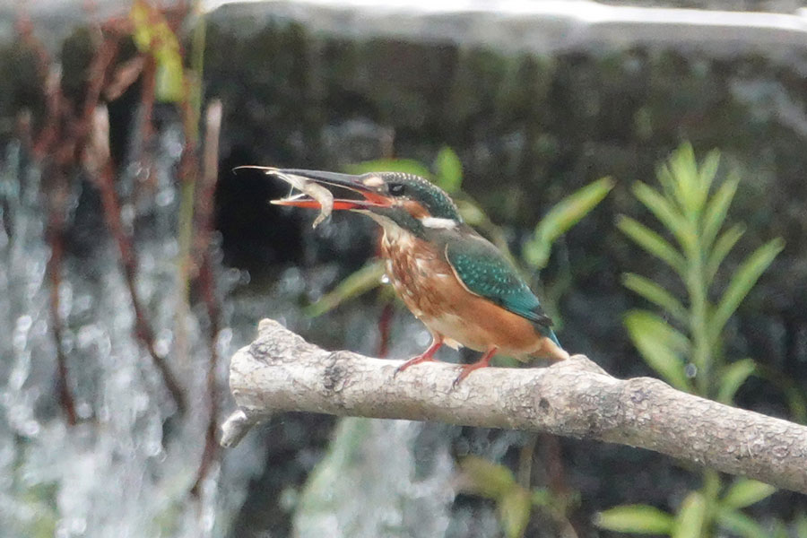 この日のカワセミは(オス)(メス)が30分位の交代で魚を捕って巣の方へお持ち帰りをしていました。
