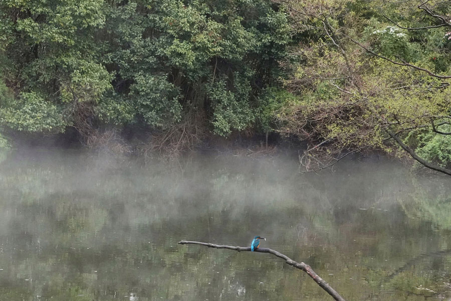 気温の激しい変化に不動池の水も蒸発し、霧の立ち上る風景でした。