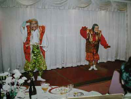 ひょっとこの面を足に付けて踊る踊りで、三村囃子連独特の芸です。