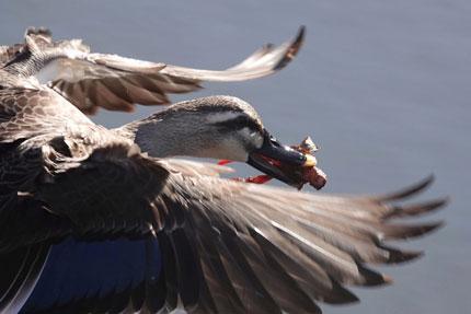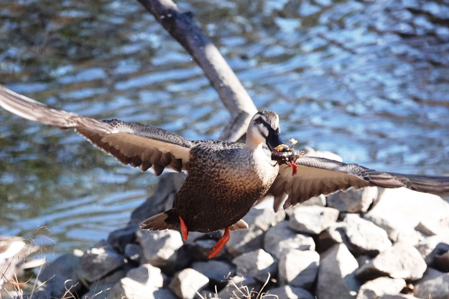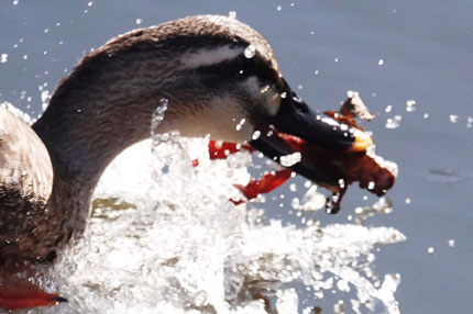 カルガモが大きなザリガニをゲットしました