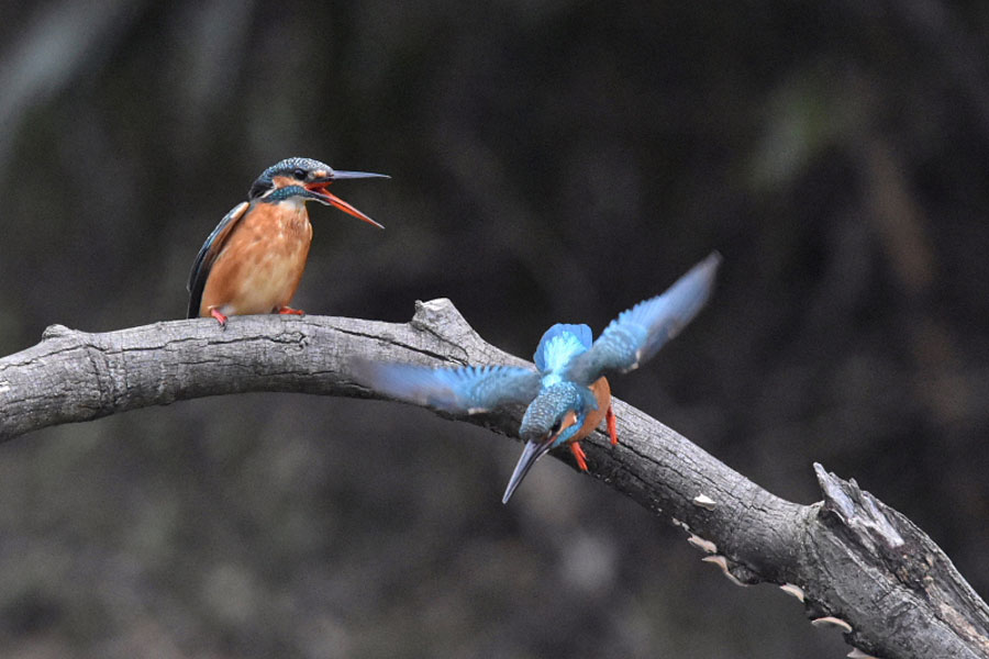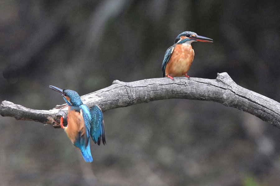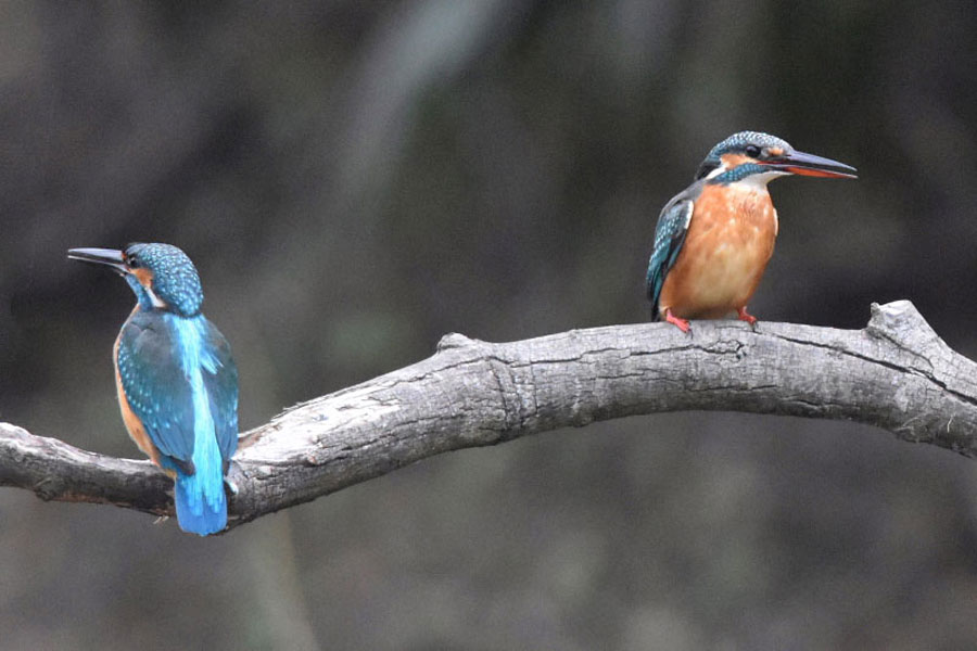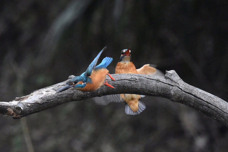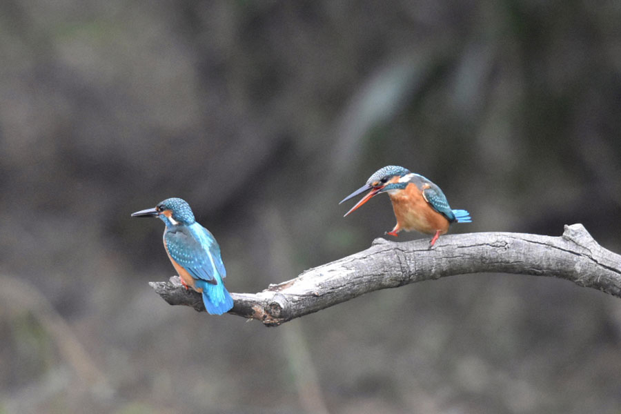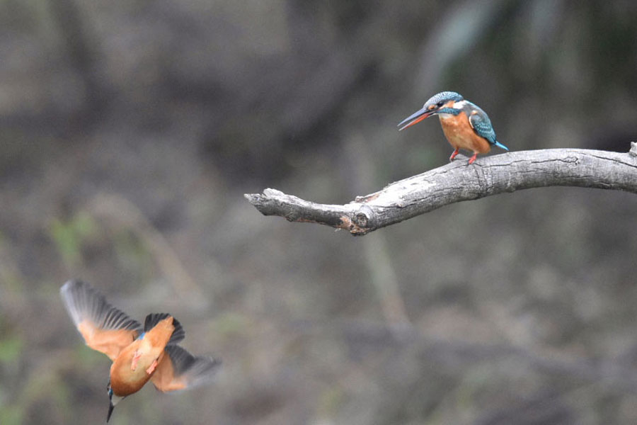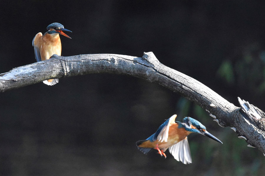 この止まり木で左のオスのカワセミが休憩している所に右側よりメスのカワセミが飛んできました。