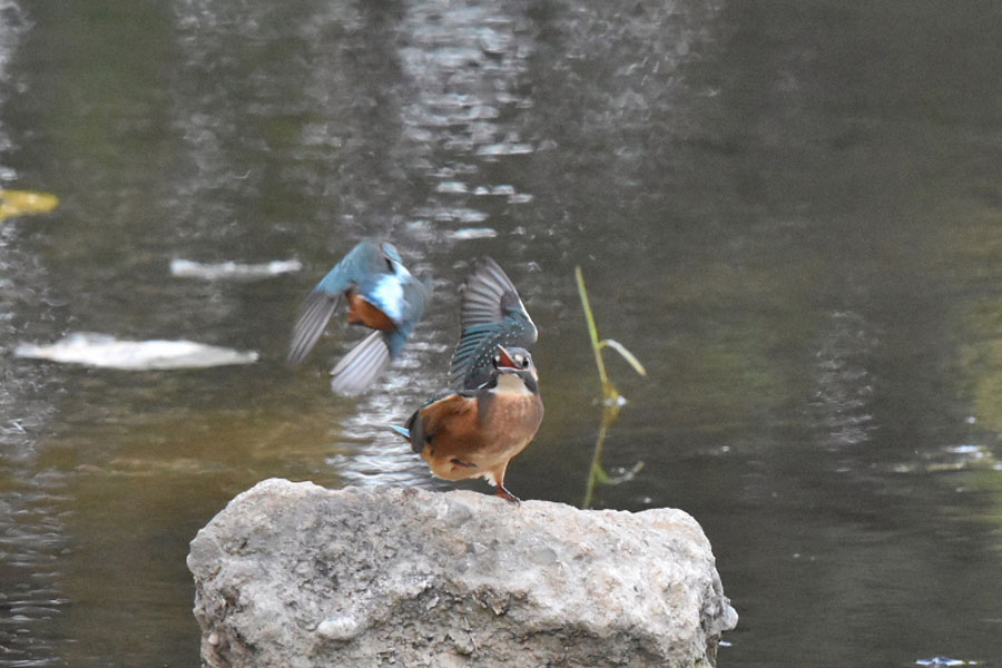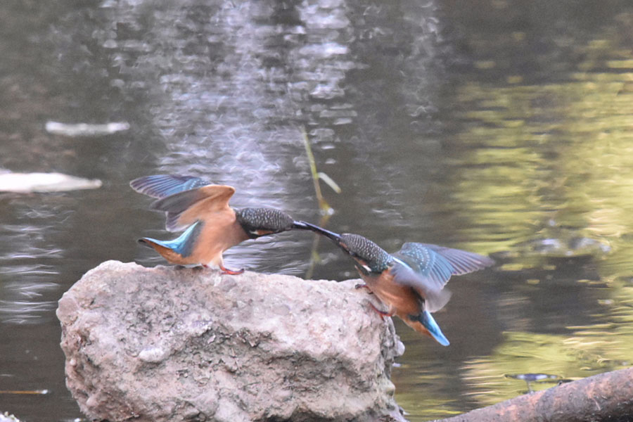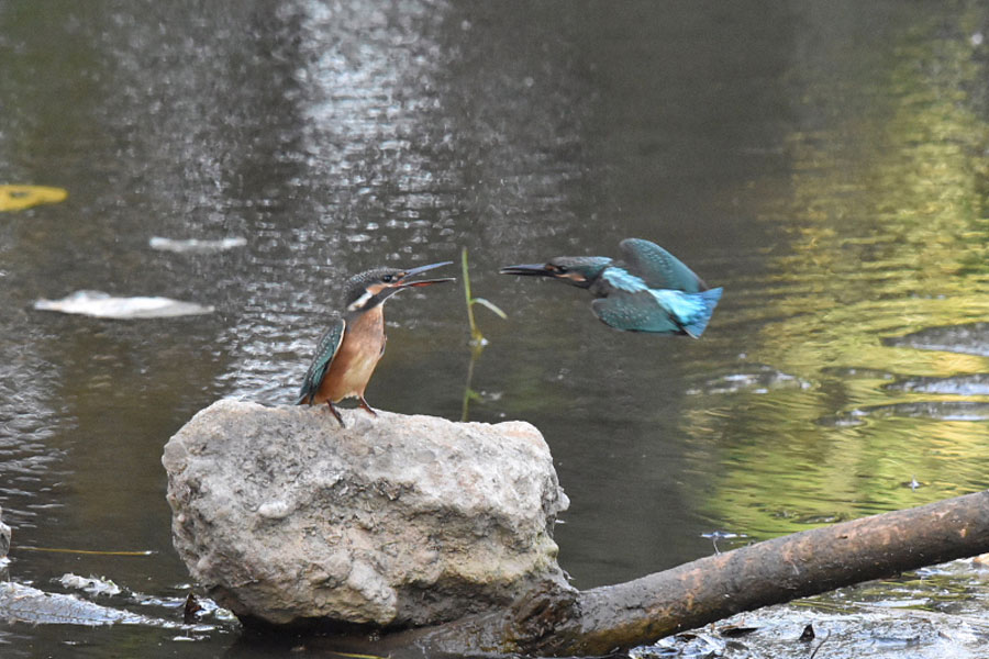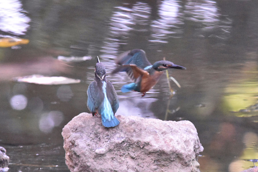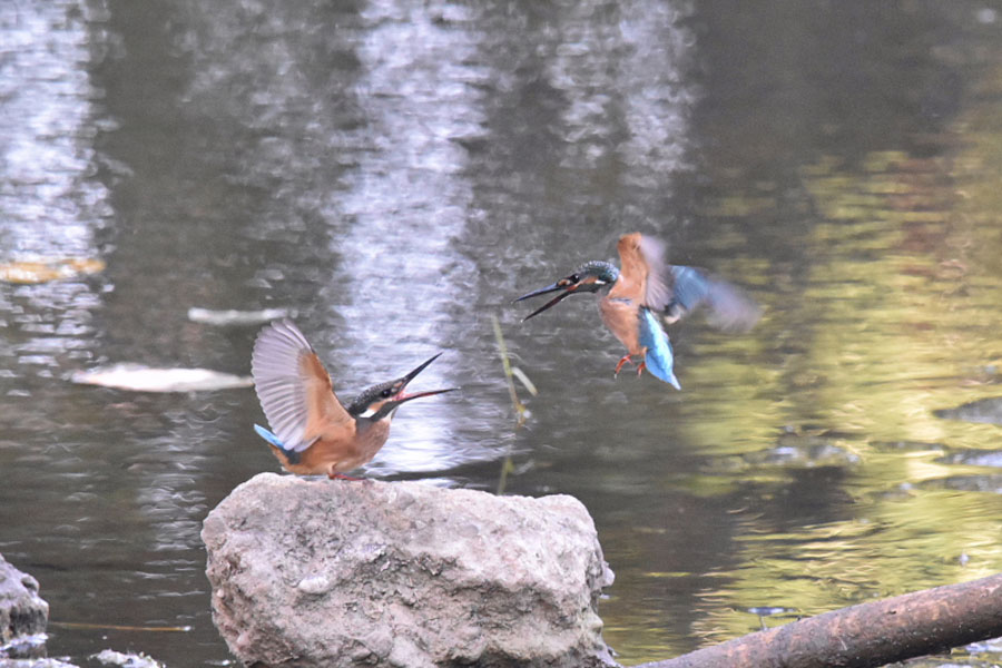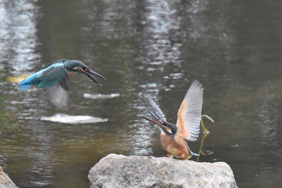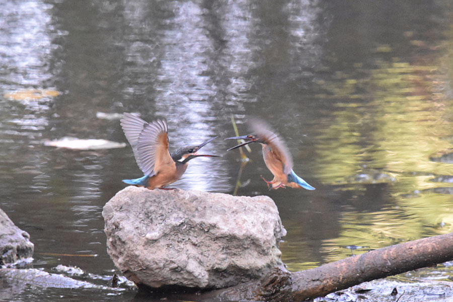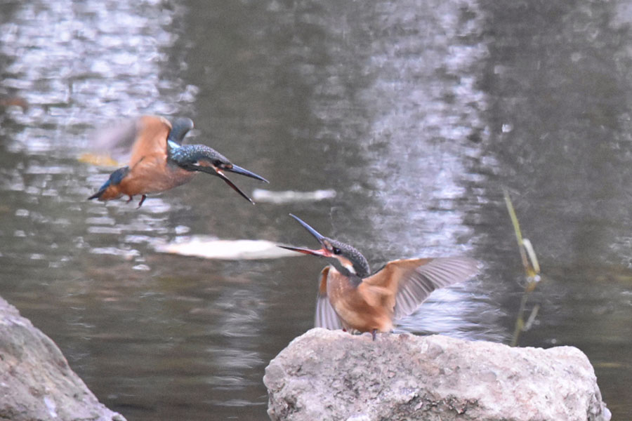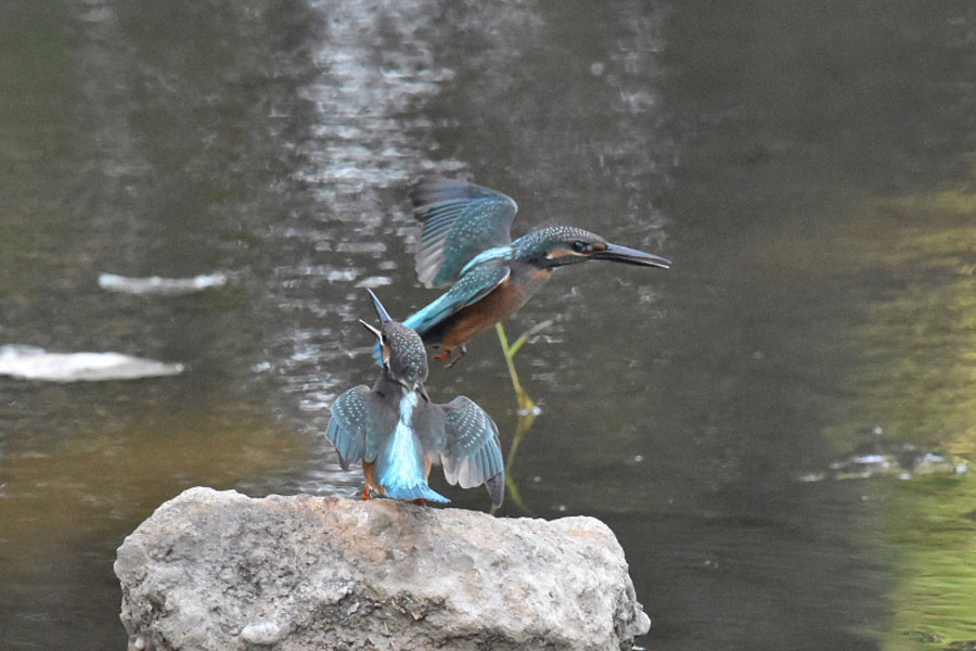 写真左側はメスのカワセミで、右側はオスのカワセミです。