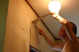 その壁紙の説明書に従い、先ずは古いクロスを剥がしから始めました。