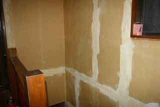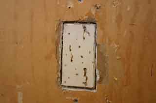 壁の穴補修 (不要のコンセント後)裏側に板をあてがい、石膏ボードを貼り付けました。段差を無くす為、石膏ボードの角は面を取りました。