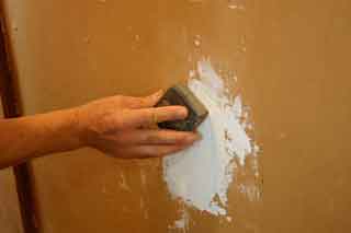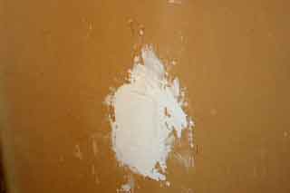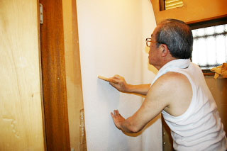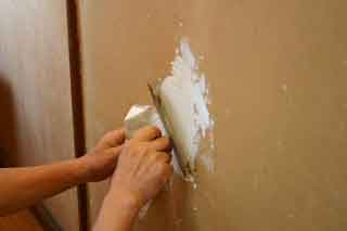 そのままでクロスを貼ってしまうと、補修した部分がはっきり見えてしまう為、傷の補修材をコテで塗りつぶし一日乾燥させます。