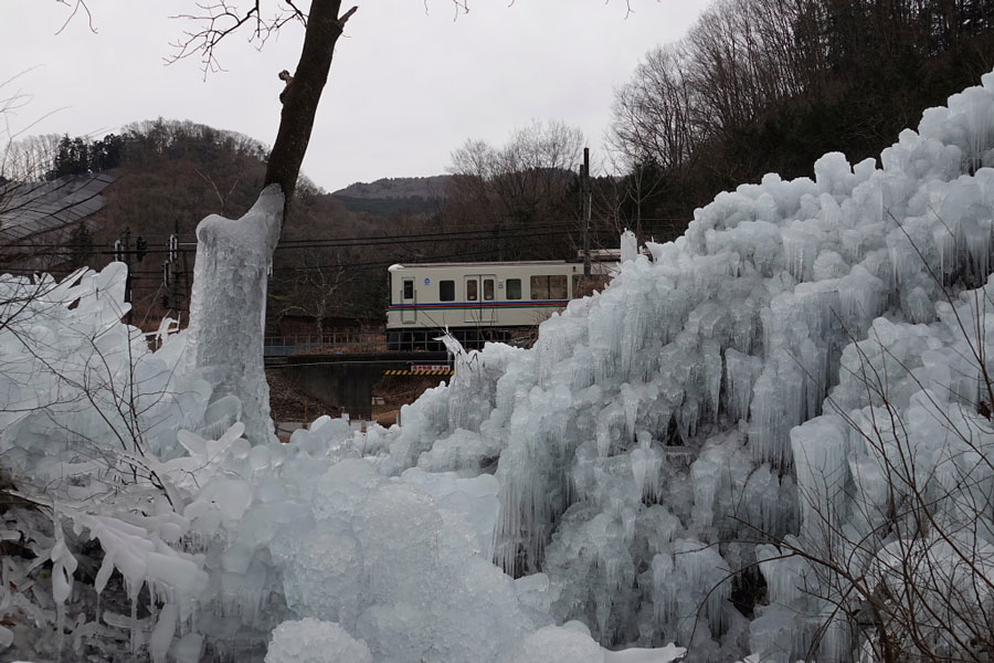 氷柱のむこうを走る西武電車