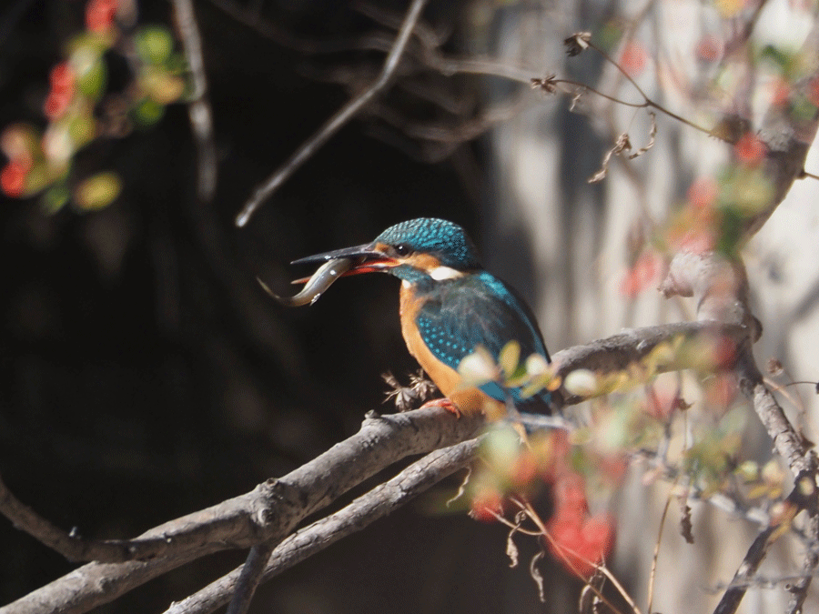 ピラカンサに止まったカワセミ