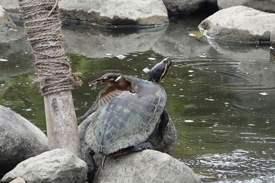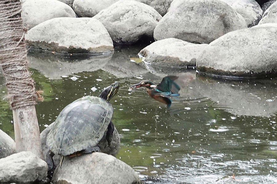 獲物を捕って飛び上がった瞬間カメと遭遇しました。 R1.8.11水元公園にて撮影