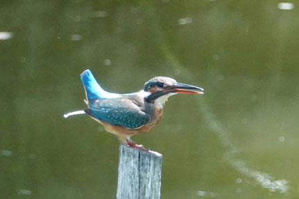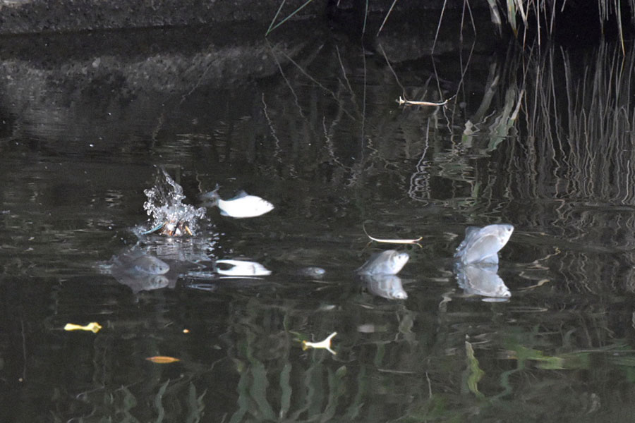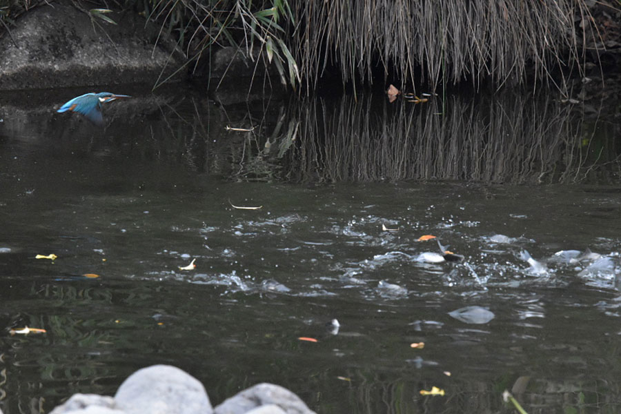 カワセミが飛び込んだ瞬間驚いた鮒が一斉にジャンプしました。