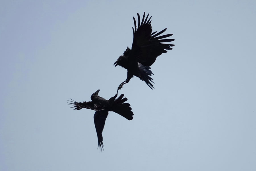 この鳥はカラスですが空中で獲物の奪い合いをしていました。