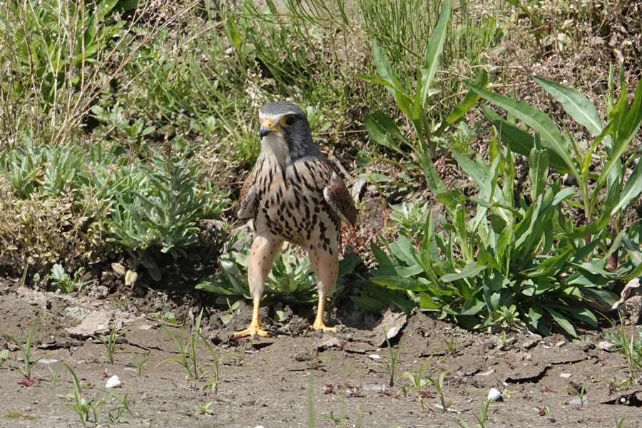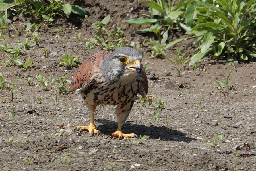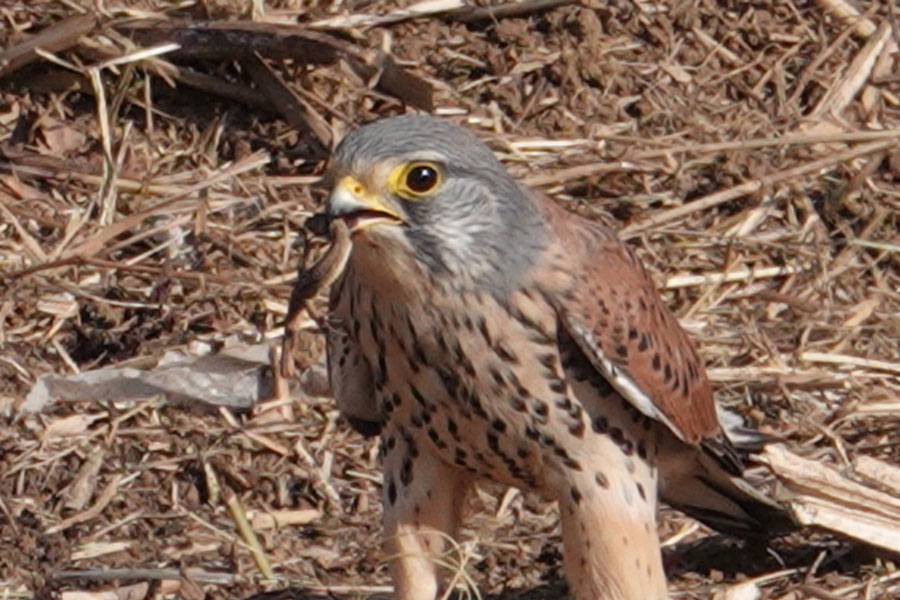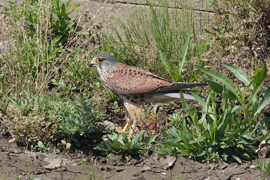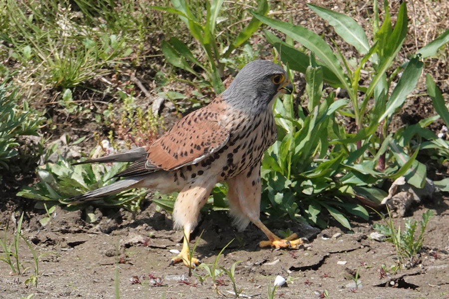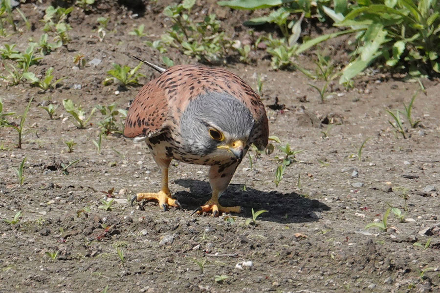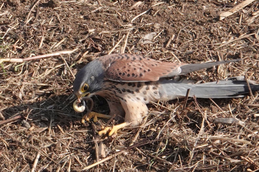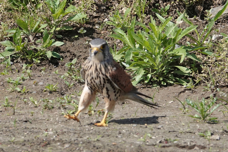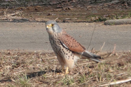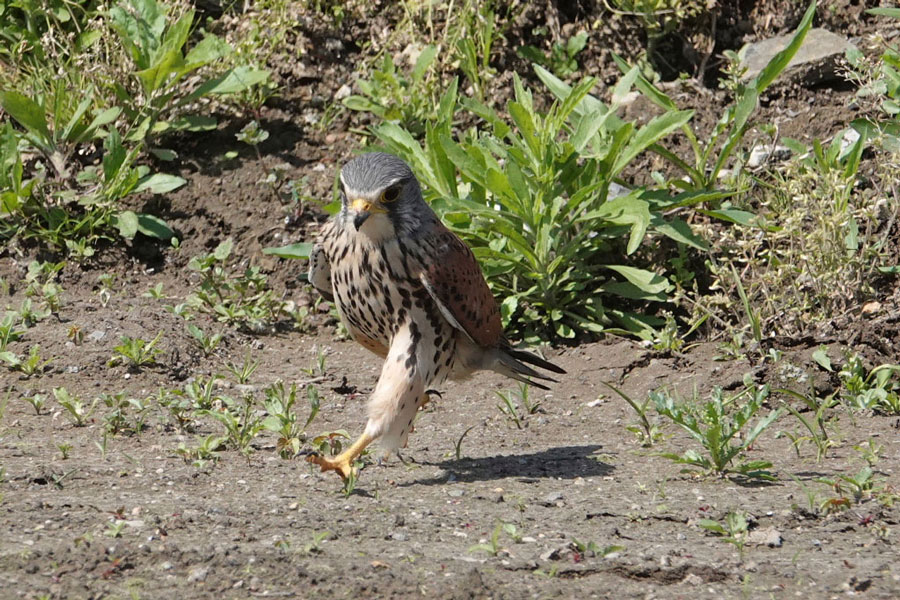 地上を歩いて獲物を探すチョウゲンボーです。 R3.4.24矢切にて撮影