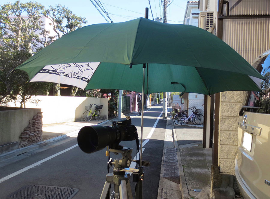 カメラに傘を取り付け、雨や直射日光からカメラを守ります。