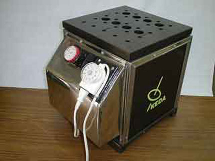 本機は庫内を100度〜130度に暖め、ボールにトイレットペーパーを幾重にも巻いて袋に入れ、ボールの破裂を避けるためボールをゆつくり回転させ、ボールの表面に出て来たオイルをトイレットペーパーに吸収させる装置です。